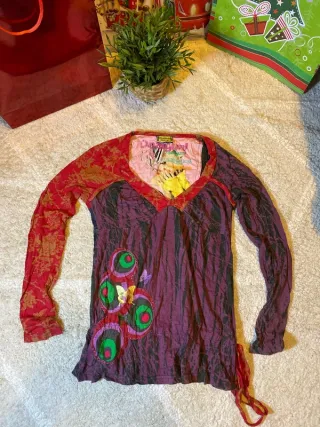 Camiseta de manga larga con un diseño vibrante y original. - Estampado floral en las mangas. - Detalle de círculos con mariposas en la parte delantera. - Acabado arrugado y con cordones laterales.
