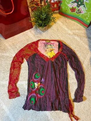 Blusa de manga larga con un diseño vibrante y detalles únicos. - Mangas acampanadas con volantes. - Paneles de tela superpuestos en el cuerpo. - Acabado texturizado y arrugado en algunas secciones.