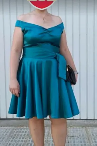 Elegante vestido de fiesta en color aguamarina, ideal para eventos especiales. - Escote Bardot. - Cinturón a juego. - Falda con vuelo. Utilizado en 2 ocasiones