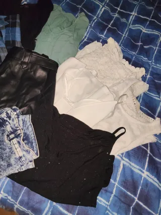 Conjunto de prendas de vestir variadas. - Camisa estampada. - Camisa verde. - Camiseta blanca con texto. - 2 Pantalón vaquero corto. - Falda negra con cremallera tipo cuero. - Pantalón largo estampado. - 2 camisetas verde y gris. - 1 jersey negro invierno.