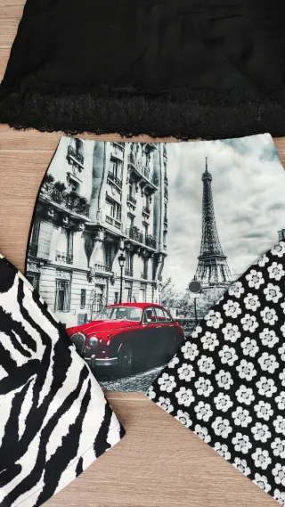 Conjunto de tres faldas con diseños llamativos. - Falda con estampado de cebra en blanco y negro. - Falda con estampado de París y la Torre Eiffel. - Falda con estampado floral en blanco y negro. - Top negro de encaje.