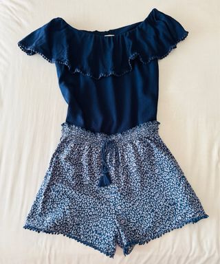 Conjunto de dos piezas para mujer, ideal para un look casual y fresco. - Top de Pimkie con diseño de hombros descubiertos y volantes. Talla s pero da más talla. - Shorts de women’secret con estampado y cintura elástica, detalle de pompones en los bordes a juego con la camiseta. Talla m