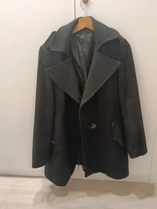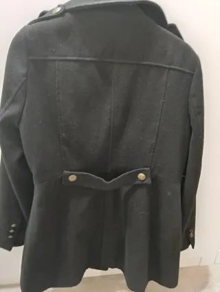 Abrigo de paño color negro de mujer. Medio cinturón posterior. Botones en mangas. Cuello de solapa. Le falta un botón en el hombro derecho y como me quedaba grande le puse otro botón para abrocharlo más entallado. Posibilidad de cambiar todos los botones. Forrado y con bolsillos. Equivale a una L.