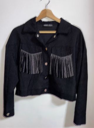 Chaqueta corta de mujer con un diseño moderno y llamativo. - Color negro. - Detalle de flecos y tachuelas plateadas en los bolsillos. - Cierre de botones. - Cuello camisero.