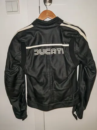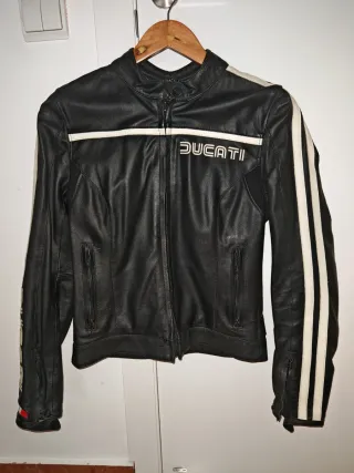 Cazadora de piel para mujer con detalles de la marca Ducati. - Diseño en cuero negro. - Rayas blancas en mangas y pecho. - Cuello mao con cierre de botón. Muy poco uso. TALLA 42