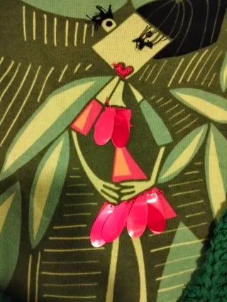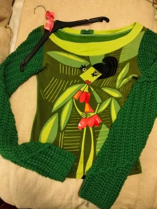 Camisa de manga larga con un diseño llamativo. - Mangas de punto grueso en color verde. - Estampado frontal con figura y motivos vegetales. - Cuello redondo.