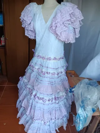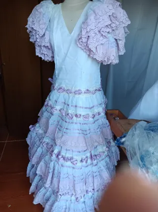 Traje de flamenca con múltiples volantes y detalles. - Mangas abullonadas con encaje. - Falda con volantes escalonados. - Adornos de lazo y encaje en capas.