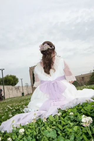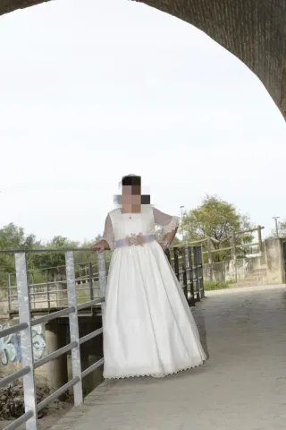 Vestido de comunión para niña, elegante y delicado. - Diseño en blanco con detalles en lila. - Mangas con encaje. - Cinturón adornado con flores.