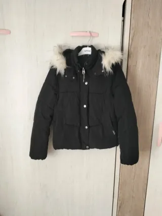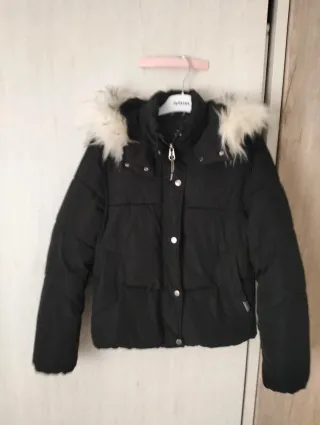 Chaqueta acolchada negra con detalles de pelo blanco en la capucha. - Cierre de cremallera. - Bolsillos frontales con botones. - Puños elásticos.