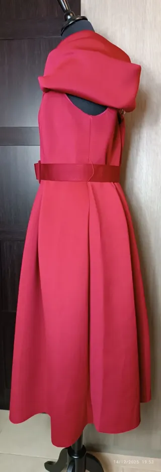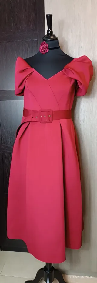 Elegante vestido de ASOS en color vino, talla 46. Presenta un diseño con escote corazón y mangas abullonadas caídas. - Cinturón a juego con hebilla cuadrada.(Al cinturón le falta una arandela) - Falda con vuelo y pliegues.
