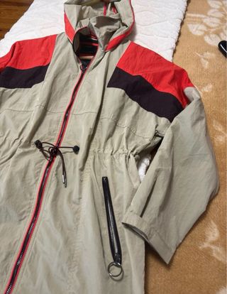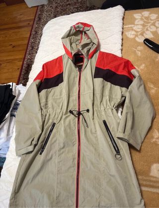 Chubasquero de mujer con un diseño moderno y práctico. - Diseño con bloques de color en rojo y marrón. - Cintura ajustable con cordón. - Cremallera frontal. - Bolsillos laterales con cremallera.