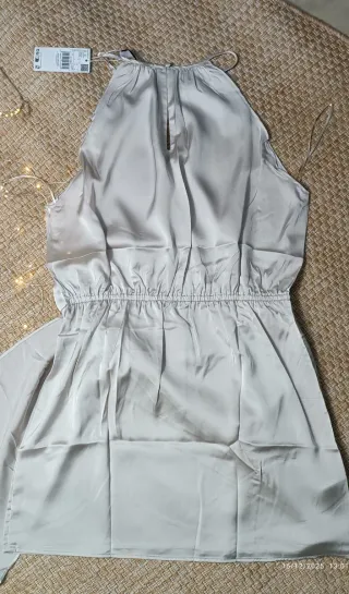 Vestido elegante de Mango con un acabado satinado. - Diseño con cuello halter. - Detalle de drapeado en la cintura y falda. - Corte asimétrico en la falda.