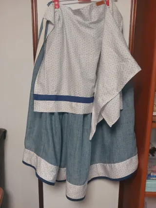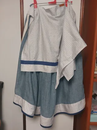 Conjunto de traje de casera con un diseño de lunares y detalles en azul. - Tejido principal de algodón con estampado de pequeños puntos azules. - Cinta azul decorativa en la parte superior. - Bajo de la falda con banda de tejido estampado y ribete azul.