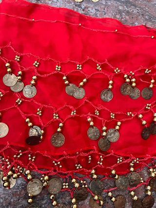 Conjunto de pañuelo y pulsera para danza del vientre, ideal para niñas. - Pañuelo de tela roja con adornos. - Pulsera a juego con monedas doradas.