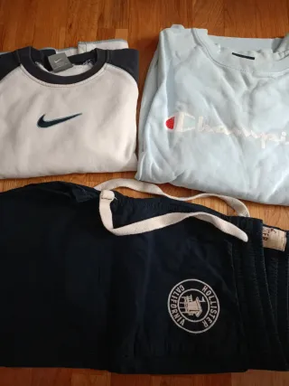 Conjunto de prendas de vestir de marcas reconocidas. - Sudadera Nike, talla pequeño, tiene alguna mancha. - Sudadera azul claro con logo Champion. - Pantalón corto azul marino con logo Hollister. La ropa está usada y alguna tiene signos de su uso, de ahí el precio.