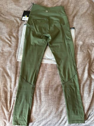 Leggings de talle alto en color verde. - Tejido elástico. - Bolsillos laterales. - Detalle reflectante en el tobillo. Se vende por equivocación en la talla. Nuevo a estrenar con etiqueta, no se ha usado nunca. Al 50% de descuento del precio que me costó. (SE VENDE TAMBIÉN CON EL TOP DE MI PERFIL)