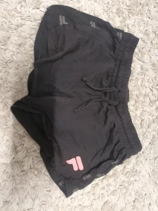 Shorts deportivos de la marca Fila. - Diseño en color negro con detalles en rosa. - Cintura elástica con cordón ajustable. - Logo de Fila visible en la parte frontal.