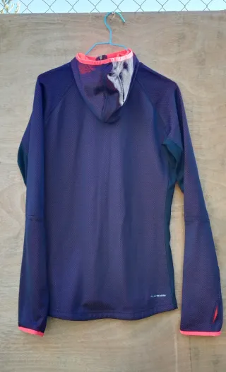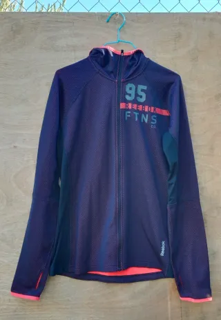 Sudadera deportiva Reebok para mujer, ideal para entrenamientos. Tejido técnico con estampado. Detalles en color coral. Puños con abertura para pulgar. Prácticamente nueva