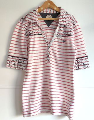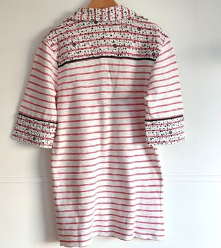 Camiseta de manga 3/4 con un diseño original de rayas y detalles estampados. - Cuello camisero. - Cierre de botones en la parte delantera. - Estampado de rayas rojas y blancas. - Mangas con puños y detalles de estampado. - Logo THD en el pecho.
