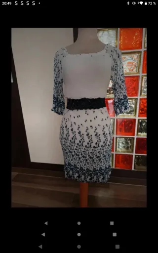 Precioso vestido de tela plisada, ideal para cualquier ocasión. Es de color blanco con estampado azul. - Diseño plisado. - Manga tres cuartos. - Escote redondo. - Estampado floral.