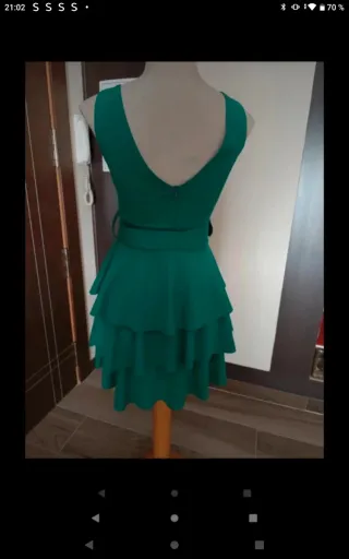 Precioso vestido de color verde, ideal para cualquier ocasión. Es de corte acampanado y tiene una bonita falda de tres niveles. Incluye un cinturón a juego. - Escote en pico. - Sin mangas. - Diseño elegante y favorecedor.