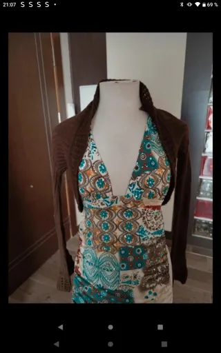 Conjunto de vestido de licra con estampado y bolero de punto. Precioso conjunto compuesto por un vestido mini de licra y una rebeca corta a juego. El vestido tiene un estampado multicolor muy favorecedor y la rebeca es de un tono marrón chocolate que combina perfectamente - Vestido de corte mini. - Rebeca de punto. - Ideal para ocasiones especiales. -Talla 36 /38 -Tela licra con lentejuelas,espalda toda descubierta -La rebeca punto canale ,cuello y mangas calado - Vestido con escote pronunciado. - Bolero de manga larga. - Tejido ligero y cómodo.