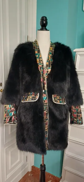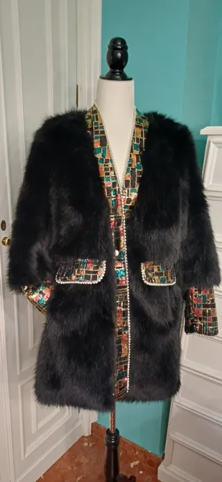 Elegante abrigo de pelo sintético en color negro. Destaca por sus detalles de lentejuelas multicolor. Talla única (36-40) - Diseño con solapas y bolsillos. - Puños adornados con lentejuelas. - Forro interior.