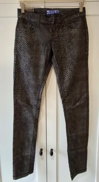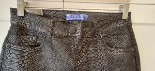 Pantalón de chica con un llamativo estampado de serpiente. - Diseño ajustado. - Cintura con trabillas para cinturón. - Cierre de botón y cremallera.