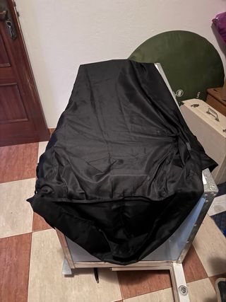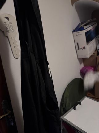 Abrigo fino de color negro, ideal para entretiempo. Presenta un diseño moderno y versátil. - Cierre de botones a presión. - Bolsillos laterales. - Capucha integrada. No tiene etiqueta, pero no me lo he puesto nunca, es finito.