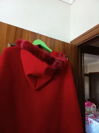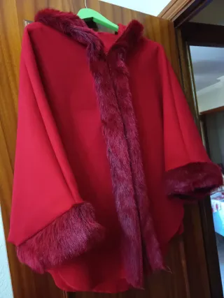 Capa elegante de color rojo, ideal para añadir un toque especial a tu atuendo. Su diseño con capucha y detalles de pelo la hacen única. - Capucha con acabado de pelo. - Puños adornados con pelo. - Cierre frontal con cremallera.