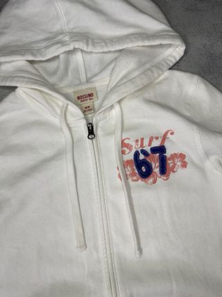 Sudadera con capucha y cremallera completa. - Diseño frontal con estampado Surf 67 y detalles florales. - Bolsillo tipo canguro en la parte delantera. - Puños y bajo elásticos. Como nueva