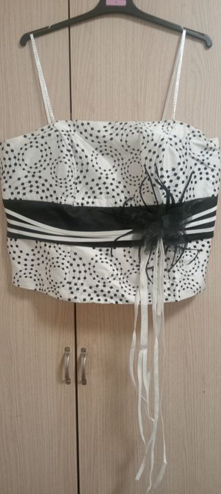 Top de mujer con un diseño llamativo y elegante. - Estampado de círculos y puntos en blanco y negro. - Detalle de cinta negra con lazo y plumas. - Tirantes finos ajustables.