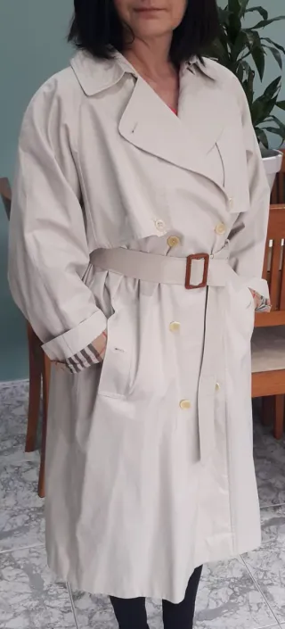 Gabardina Burberry para mujer - Color beige. - Cinturón ajustable con hebilla de cuero color camel. - Bolsillos laterales. - Talla 31 1/5 - 40cm (L). - Tiene unos pequeños puntitos a la altura de la parte trasera del puño derecho que apenas se notan, como se puede apreciar en las fotografías.