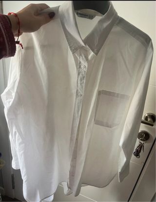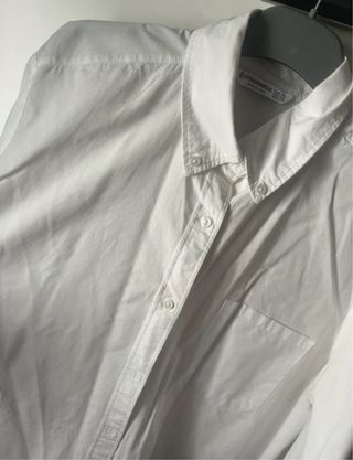 Camisa blanca de Stradivarius con corte oversize. - Cuello clásico. - Cierre de botones. - Bolsillo en el pecho.