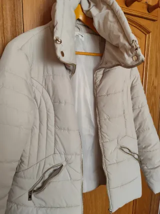 Elegante plumífero de Zara en color beige. Diseñado para ofrecer calidez y estilo. - Cuello con acabado de pelo sintético. - Cierre frontal con cremallera dorada. - Cintura ajustable con cordón y detalles de cremallera en los laterales. - Bolsillos laterales con cremallera. No se ha llegado a usar. Tiene un pequeño enganchón en una manga un poquito más abajo del hombro. Se puede arreglar (última foto)