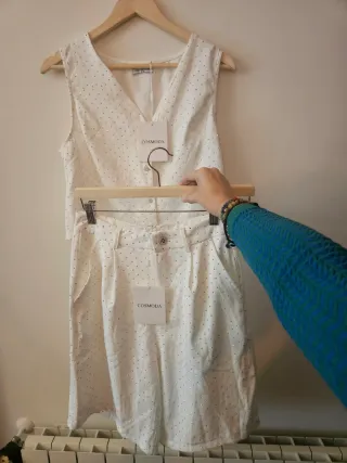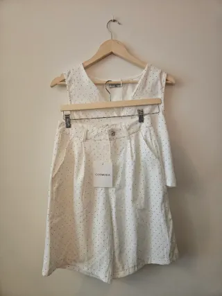 Conjunto de dos piezas para mujer. - Top sin mangas con escote en V. - Pantalón corto con bolsillos. - Diseño con pequeños detalles plateados.