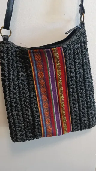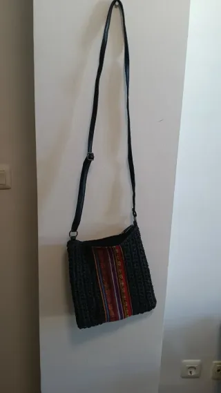 5 prendas varias marcas: - Bolso tejido negro con motivos étnicos y Cierre de cremallera. - Falda vaquera a palas. - Chaqueta gris a rayas en relieve. - Camiseta de tirantes Mango con flecos. - Blusa manga corta estampado de árboles.