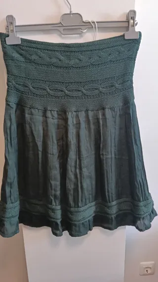 Pack de 4 prendas de ropa para mujer varias marcas: - Falda acampanada verde con detalles de crochet. - Pantalón beige sin estrenar - Sudadera gris Billabong - Camisa de cuadros felpa.