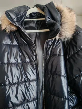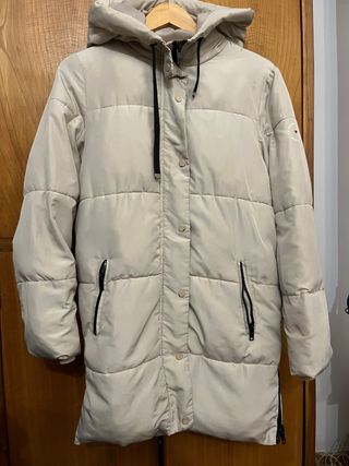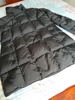 Parka acolchada tipo plumas con acabado brillante y capucha desmontable,a estrenar. Perdí el ticket y ya no la puedo devolver. - Cierre de cremallera. - Detalle de pelo en la capucha. - Bolsillos laterales. Es muy ligera y abrigada ,no pesa nada Talla única que se adapta desde una talla 46 a 56. Contorno pecho 140 cms Contorno cintura 150 cms Largo 84 cms