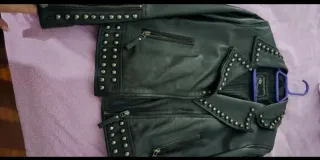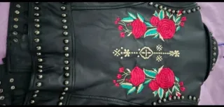 Chaqueta de estilo biker con un diseño único y llamativo. En PIEL con bordado en la espelda y tachuelas en cuello y mangas con cremalleras.MUESTRA EXCLUSIVA pvp 290e - Confeccionada en cuero. - Adornada con tachuelas plateadas. - Bordados florales en rojo