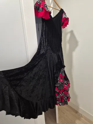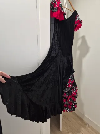 Vestido de flamenco con un diseño llamativo y elegante. - Cuerpo del vestido en terciopelo negro. - Mangas y volantes con estampado de lunares rojos y corazones. - Flecos decorativos en el cuerpo. - Falda con volantes y corte asimétrico. Puesto una vez para una actuación nuevo. La talla es una M más o menos. Puedo enviar medidas