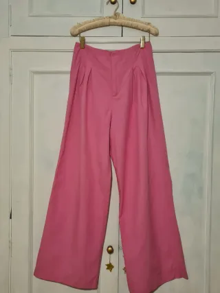 Pantalón de Zara de corte ancho y tiro alto. - Color rosa fucsia vibrante. - Diseño de pierna ancha (wide leg). - Cintura de tiro alto para un ajuste favorecedor. - Tejido: mezcla de viscosa, algodón y lino. - Diseño sin cinturilla para un efecto limpio y estilizado en la cintura. - Frontal con pinzas. - Bolsillos traseros falsos (tipo vivo). - Cierre con cremallera frontal invisible, gancho metálico y botón interior. - Talla S. - Dejo medidas en fotos. - Precio original 29,95€. Usado en MUY BUEN ESTADO. #pantalones anchos, zara woman, pantalon entretiempo, verano, mujer, rosa intenso, talla 36, streetwear, casual, ligero #