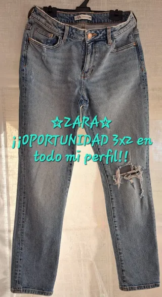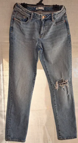 Pantalón vaquero de Zara para mujer. Un básico para tu armario. - Diseño desgastado y con rotos. - Corte recto. - Tiro alto.