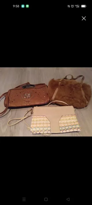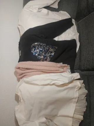 Pack de 5 prendas de ropa varias marcas: - Rebeca punto beige claro. - Rebeca punto negra - Blusa azul marino. - Sudadera turquesa. - 3 foulares