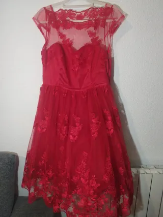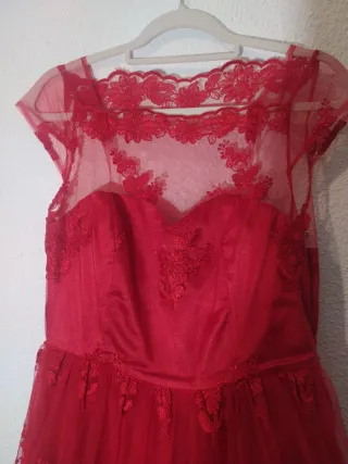 Elegante vestido de fiesta de Maribel Ruiz. - Diseño en color rojo vibrante. - Talla XL / 42 / 14. - Confeccionado con detalles de encaje y tul.