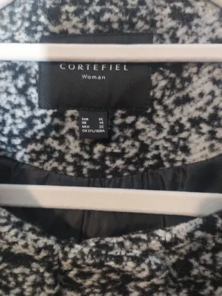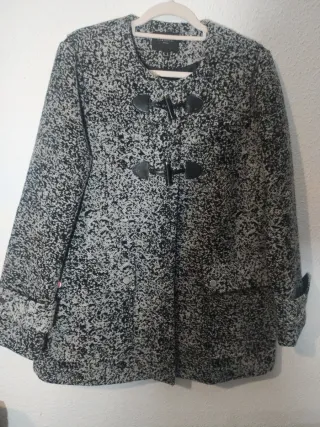 Abrigo de la marca Cortefiel en talla XL. Presenta un diseño jaspeado en tonos negros y grises, con cierres de estilo toggle. - Diseño jaspeado. - Cierres de estilo toggle. Muy poco uso.