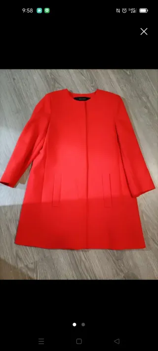 Abrigo largo de mujer en color rojo. Presenta un diseño elegante con solapas y dos botones. - Dos bolsillos frontales. - Cierre de doble botón.