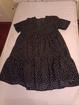 Vestido negro con estampado de lunares blancos. Tiene un corte escalonado que le da mucho movimiento. - Manga corta. - Cuello redondo. - Diseño escalonado.
