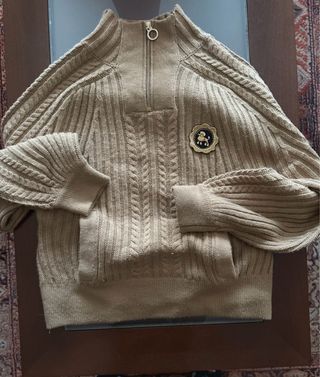 Jersey de punto con un diseño muy preppy y detalles de trenzas. Precioso jersey de punto de Highly Preppy , talla S valorado en 150€. Como Nuevo. - Cuello alto con cremallera. - Parche decorativo en el pecho. - Bolsillo tipo canguro.