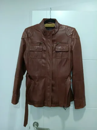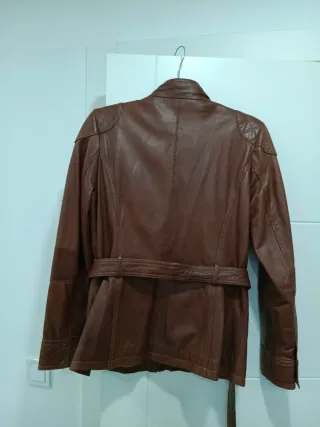 Cazadora de cuero con un diseño elegante y moderno. - Material: Cuero genuino. - Color: Marrón. - Cierre de cremallera. - Bolsillos frontales con cremallera. - Cinturón ajustable en la cintura. - Detalles acolchados en los hombros.